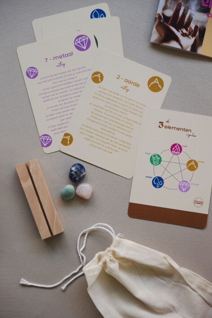 - per element uit de Energie Code twee affirmatie kaarten met uitleg over het element en een affirmatie
